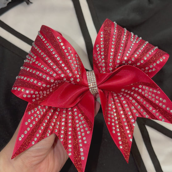 The Radiant Burst Cheer Bow features a stunning fan pattern of rhinestones that creates bold sparkle from every angle. Add dramatic sparkle to your cheer uniform with this handcrafted rhinestone cheer bow. Featuring a satin base, glitter accent panels, and a radiant rhinestone fan design, this bow shines under lights and stands out on the competition floor.