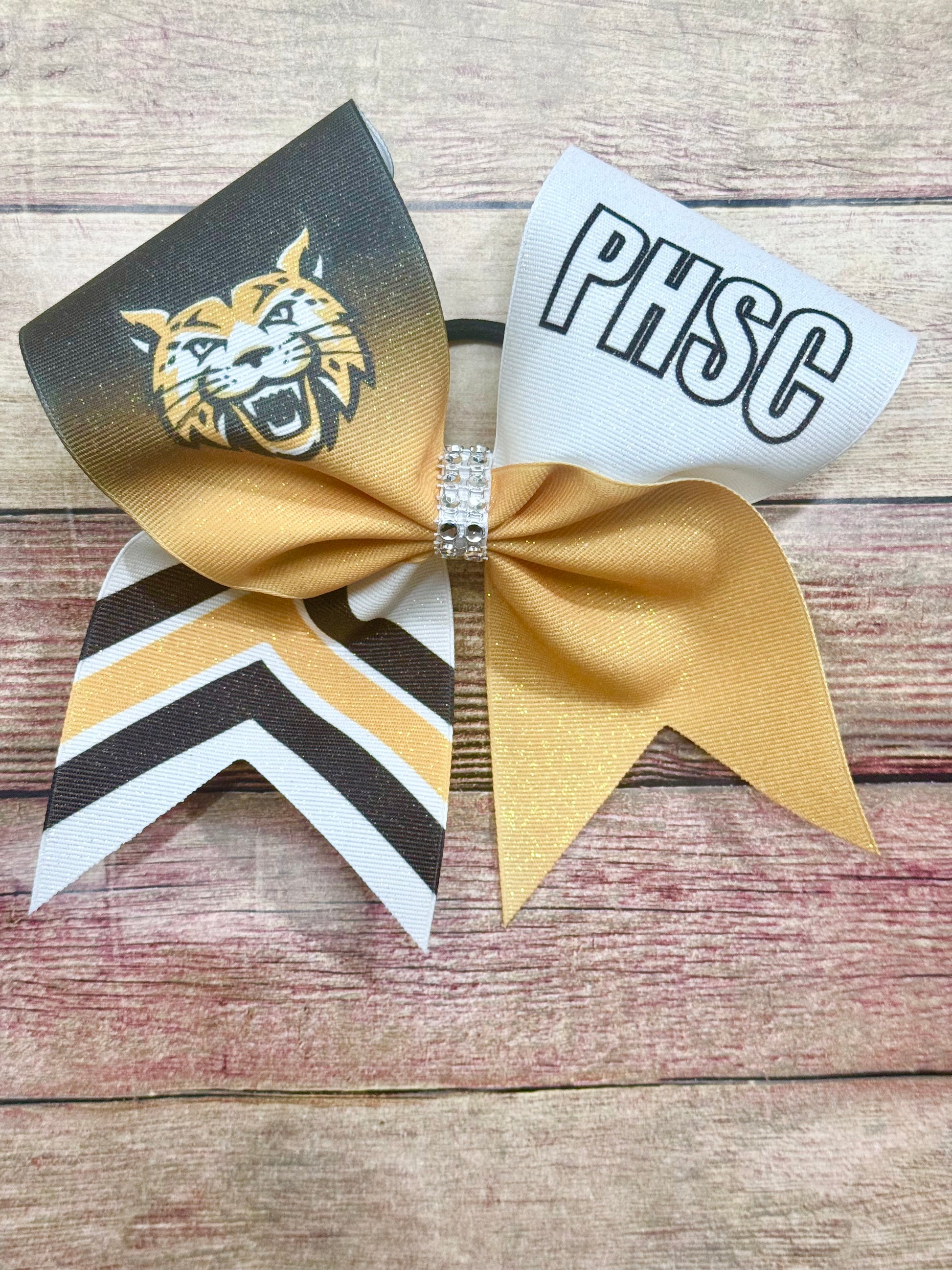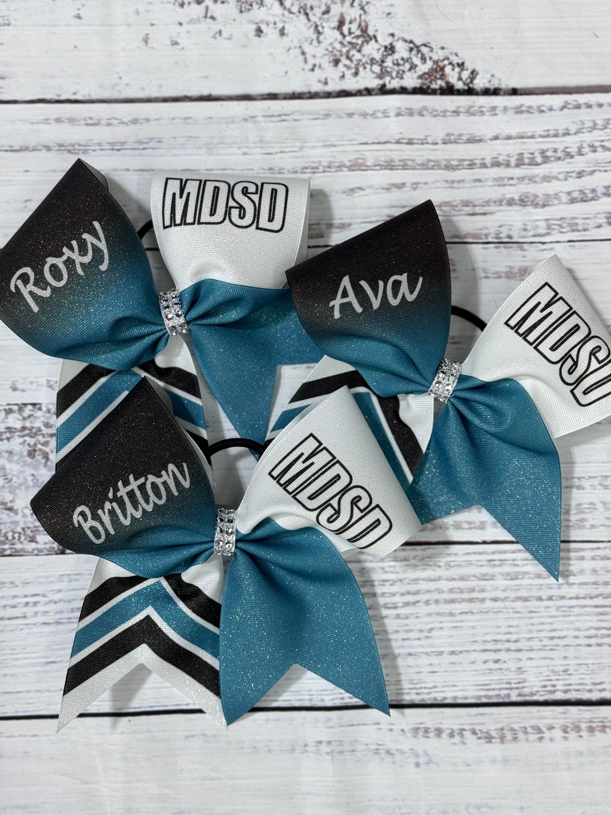 Introducing our stunning 3-inch cheer bow made on glitter ribbon and fully customizable with your team's logo on the left loop and team name on the right loop. The left tail features a playful chevron design, adding a touch of fun to your cheer ensemble.