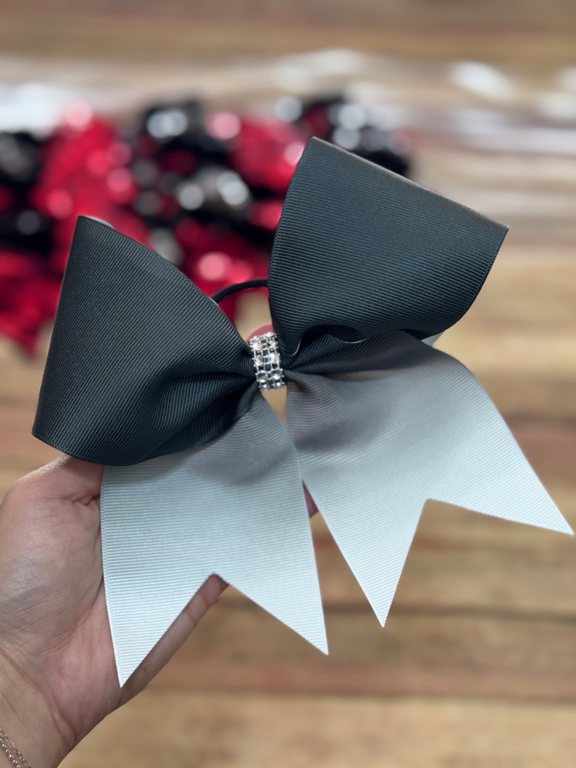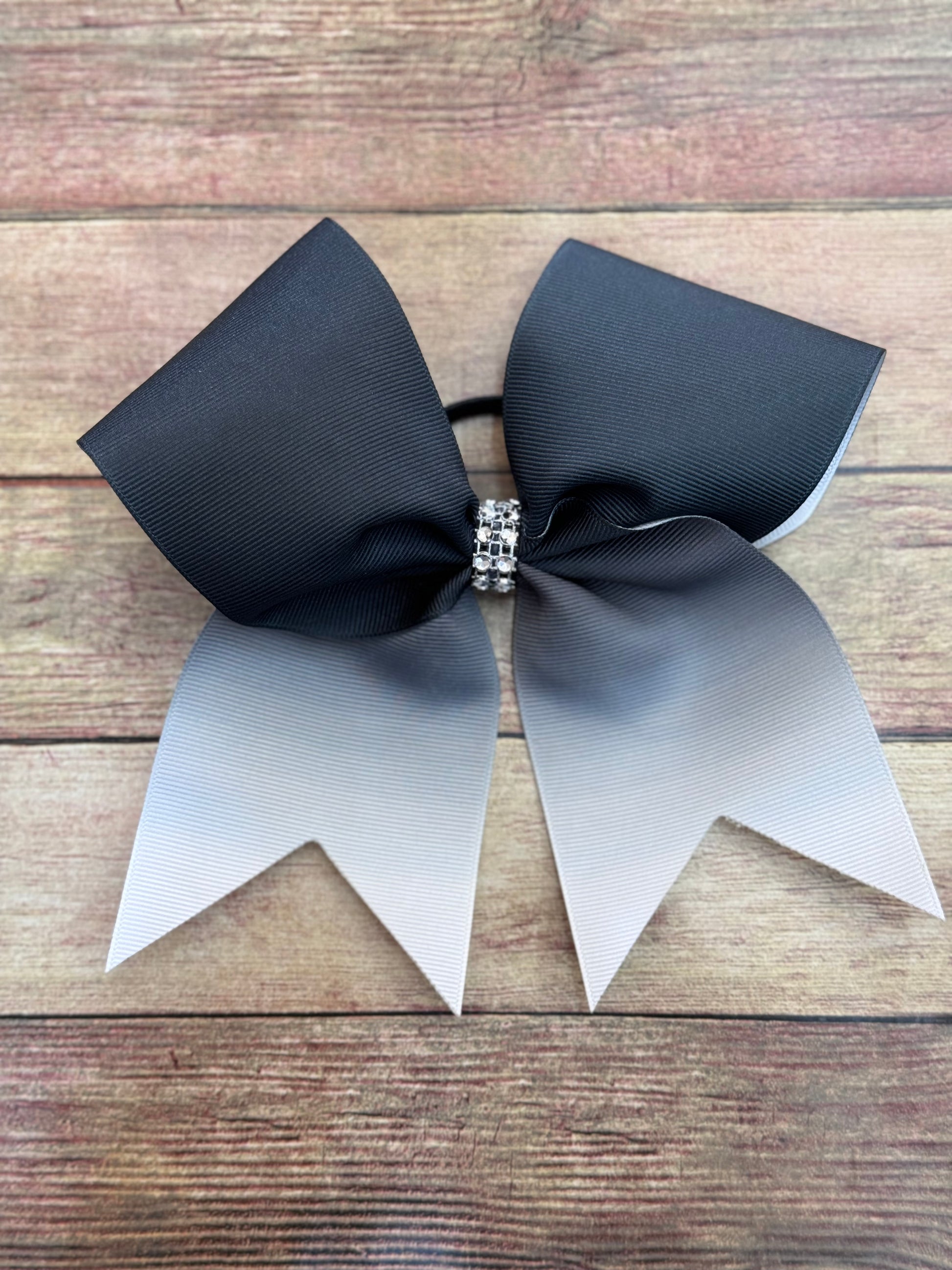 This black ombré sublimated cheer bow on grosgrain ribbon is a perfect accessory for sports teams, school spirit, dance, and cheer. It is designed to add a touch of style to any outfit.