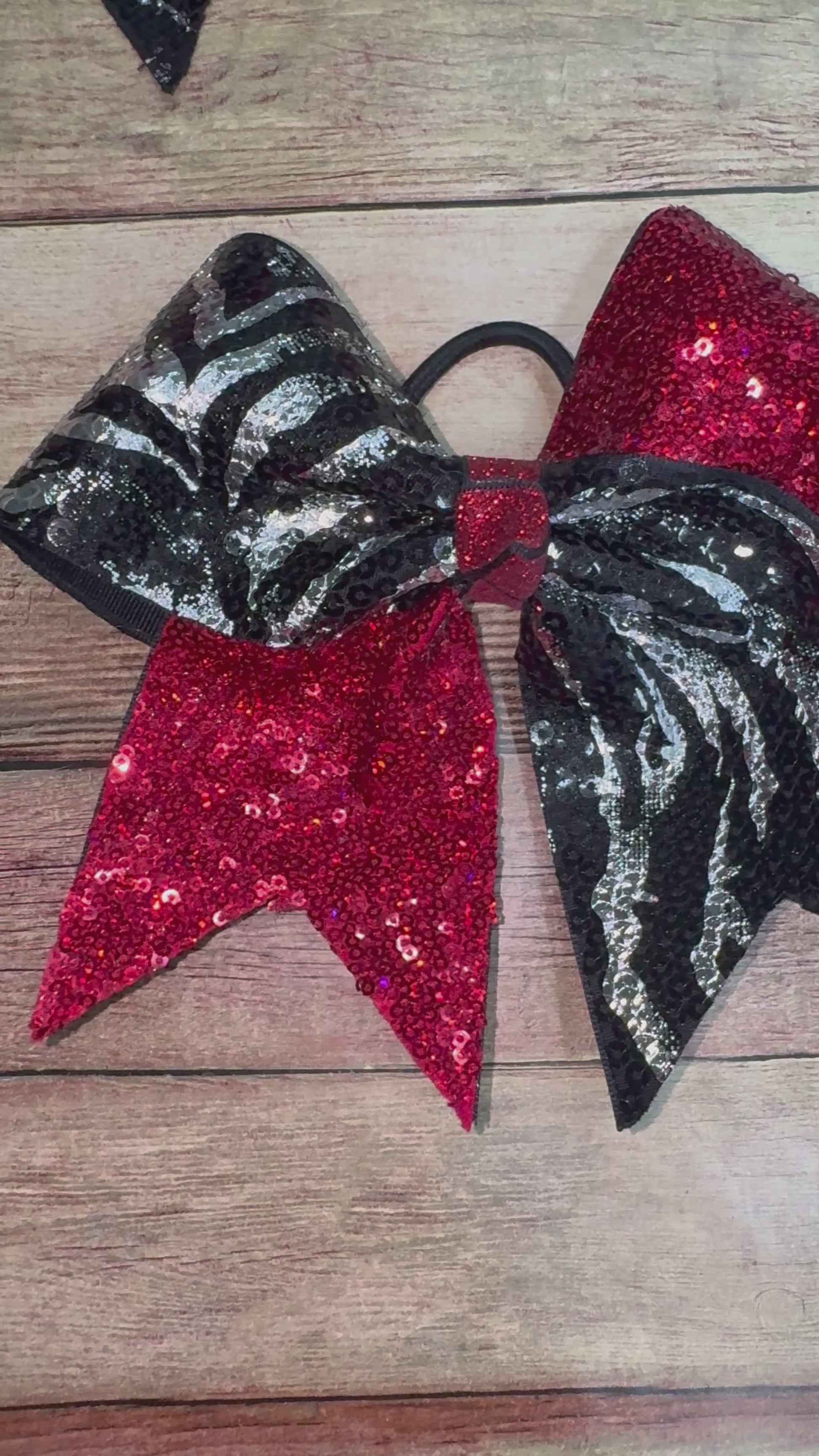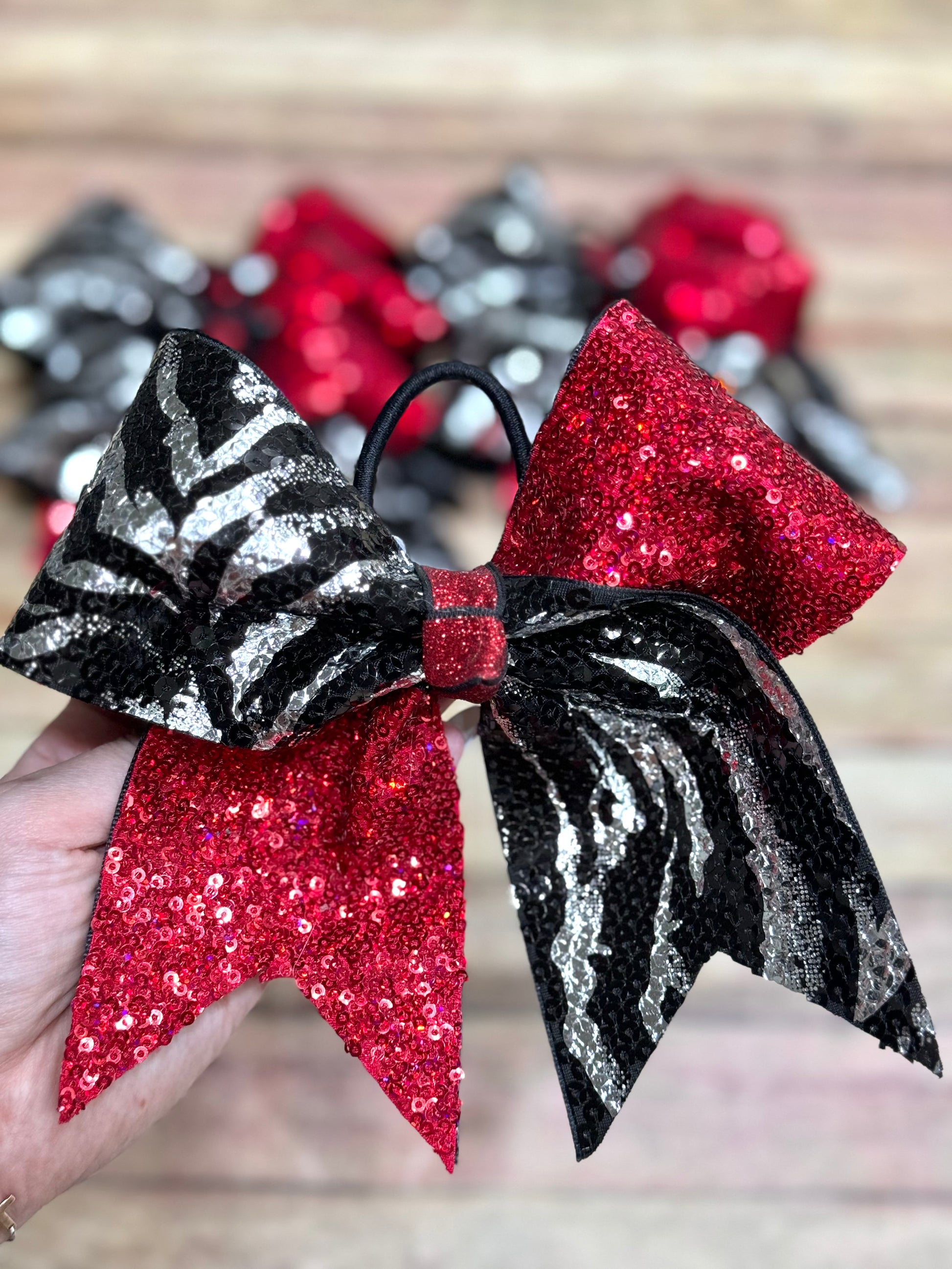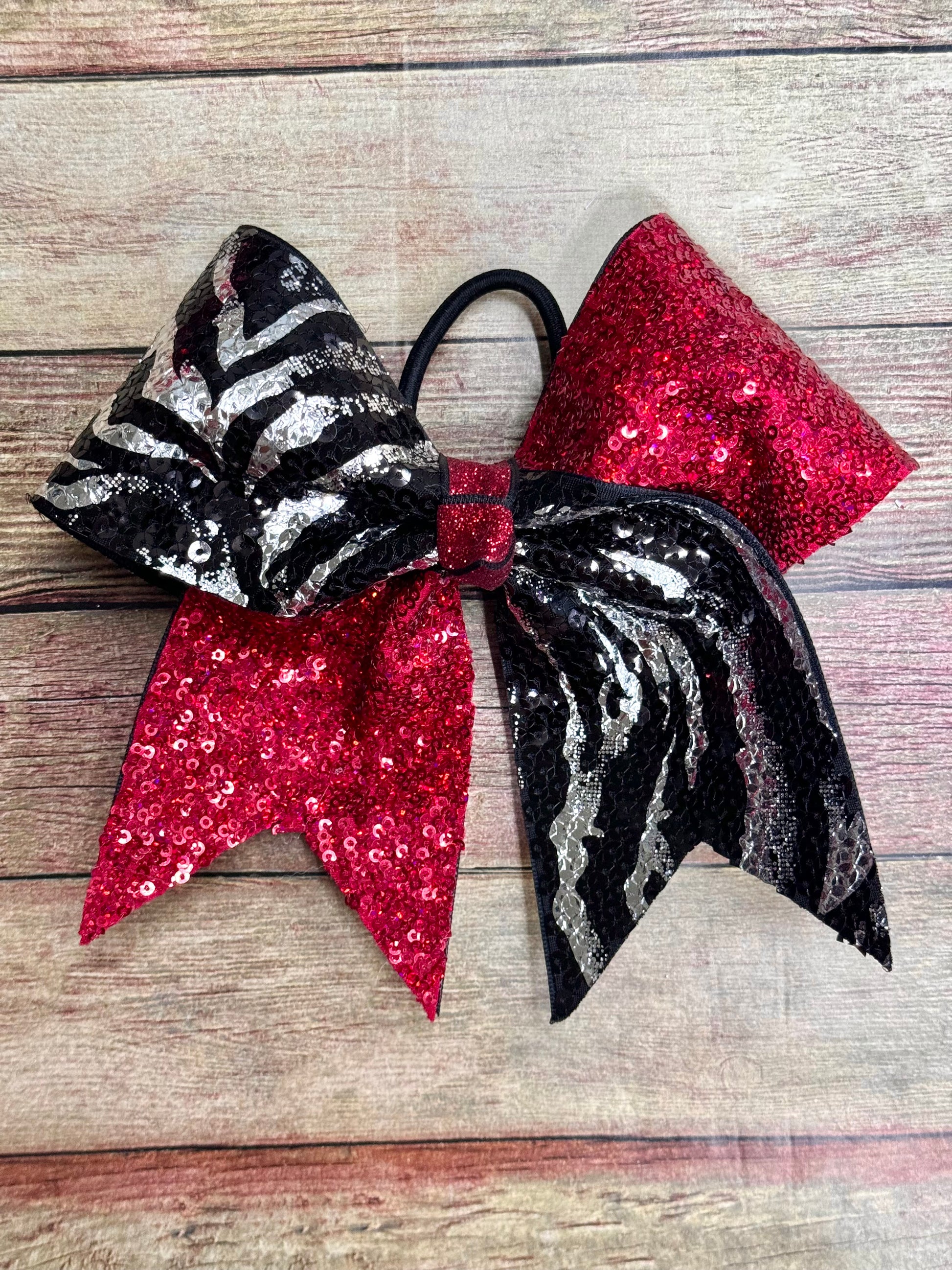 Introducing our stunning 3 inch extra large cheer bow, handcrafted with care in the USA by our family-owned and operated business. This eye-catching bow features a combination of red sequin fabric on the right loop and left tail, and black and silver zebra print fabric on the left loop and right tail. The vibrant colors and bold patterns make this bow a perfect accessory to stand out on the cheerleading field.