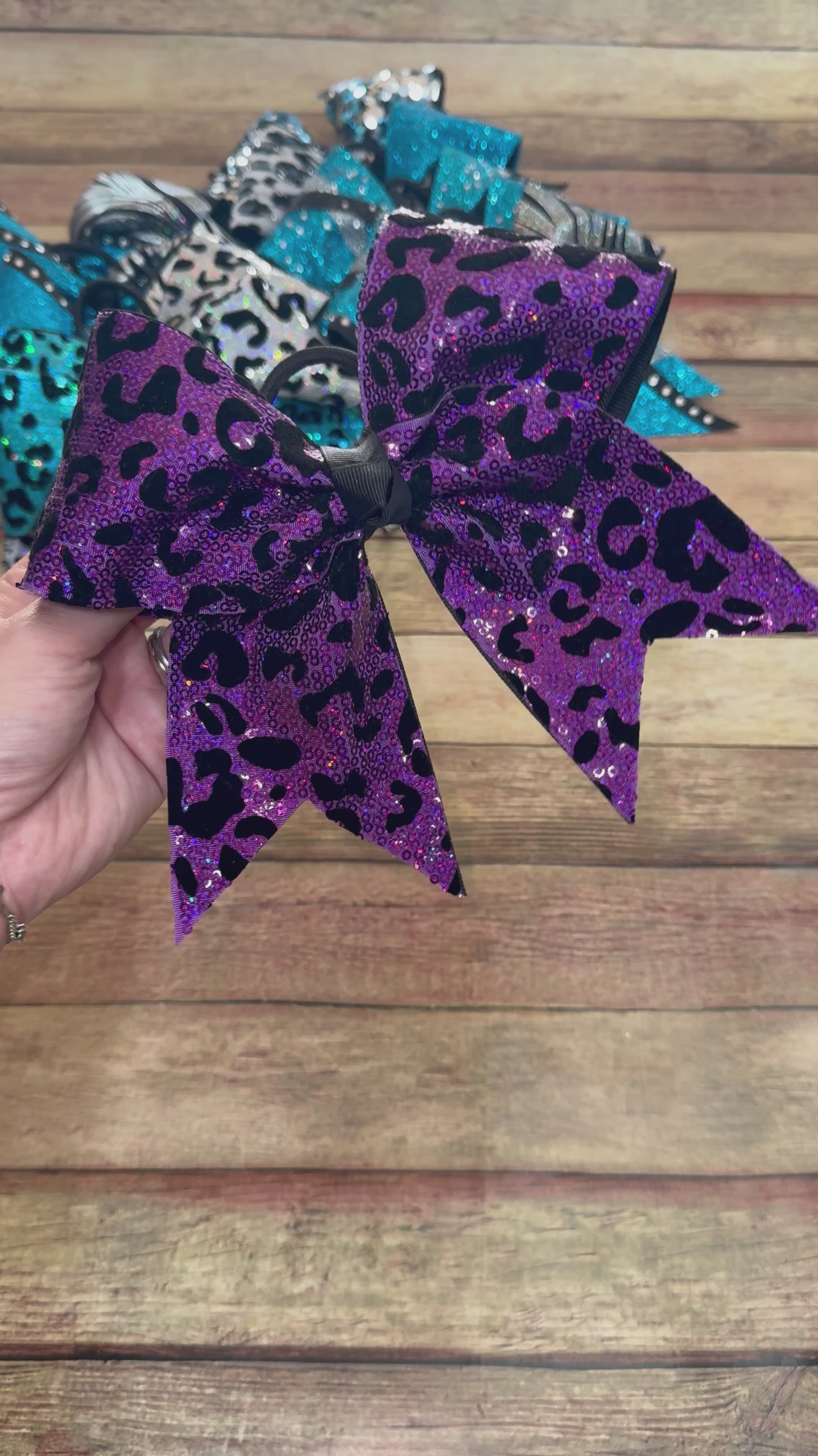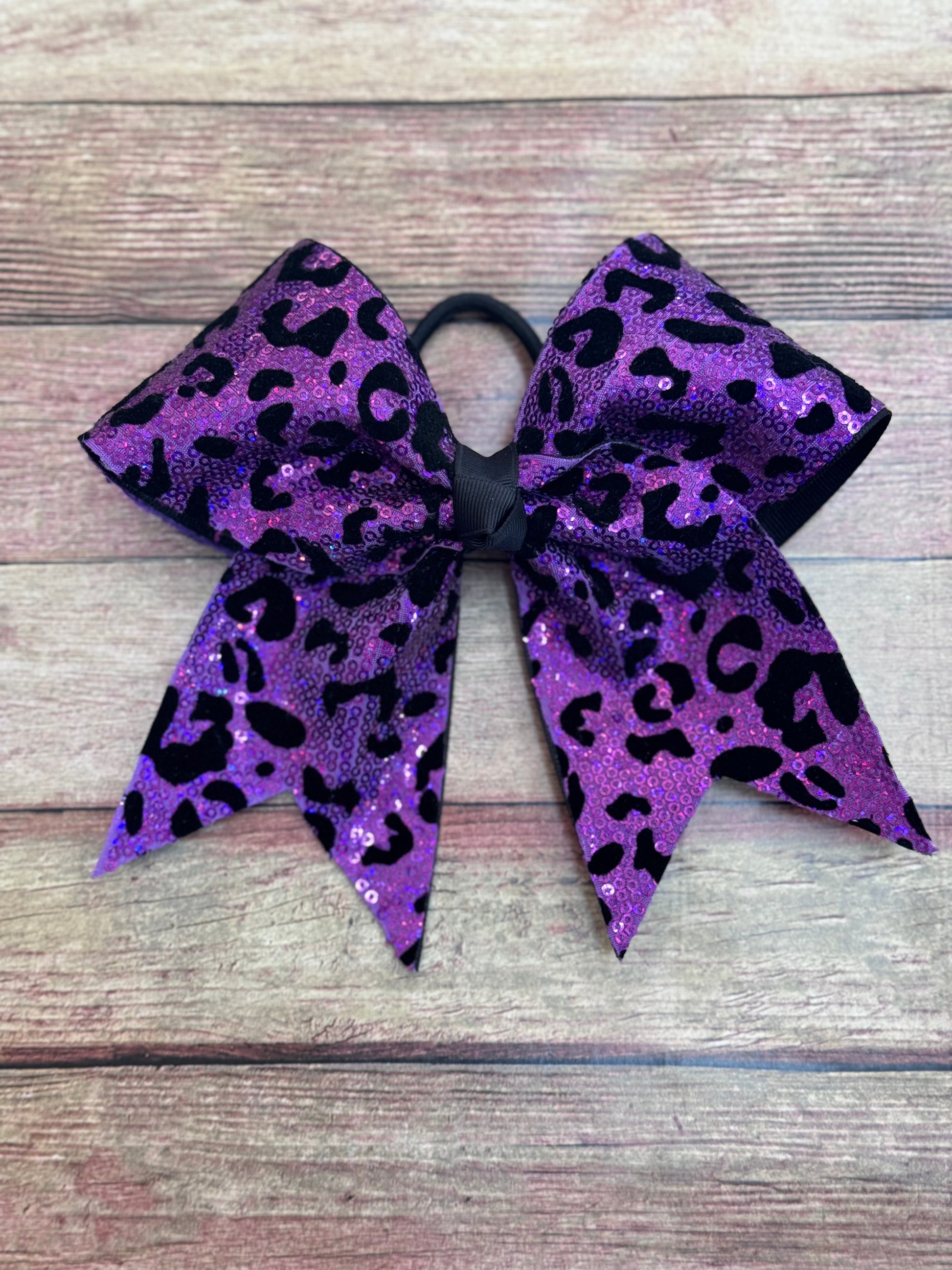 Introducing our stunning purple fabric sequined cheer bow with leopard print! This bow is perfect for dance, cheer, sports, and showing your school spirit.