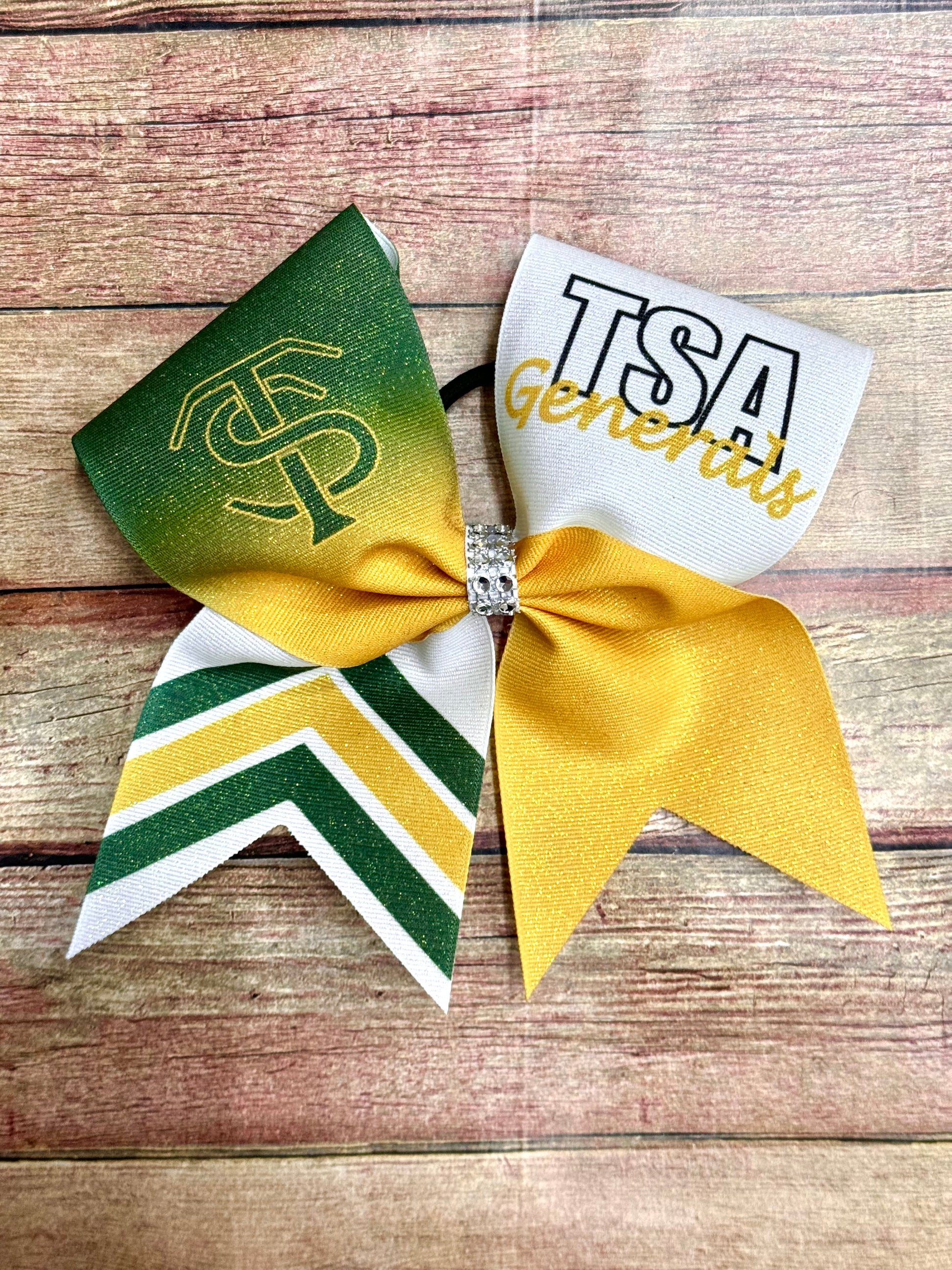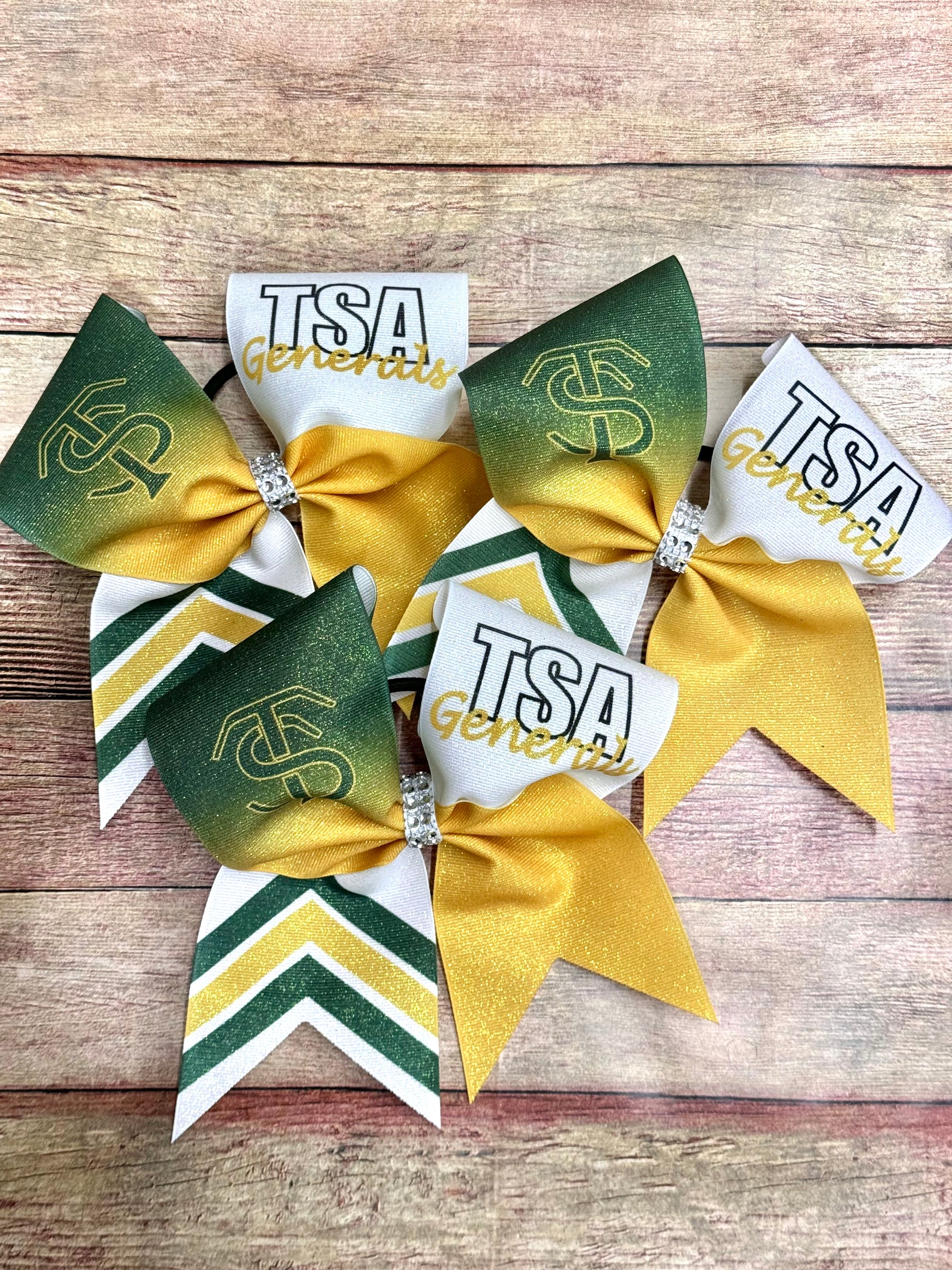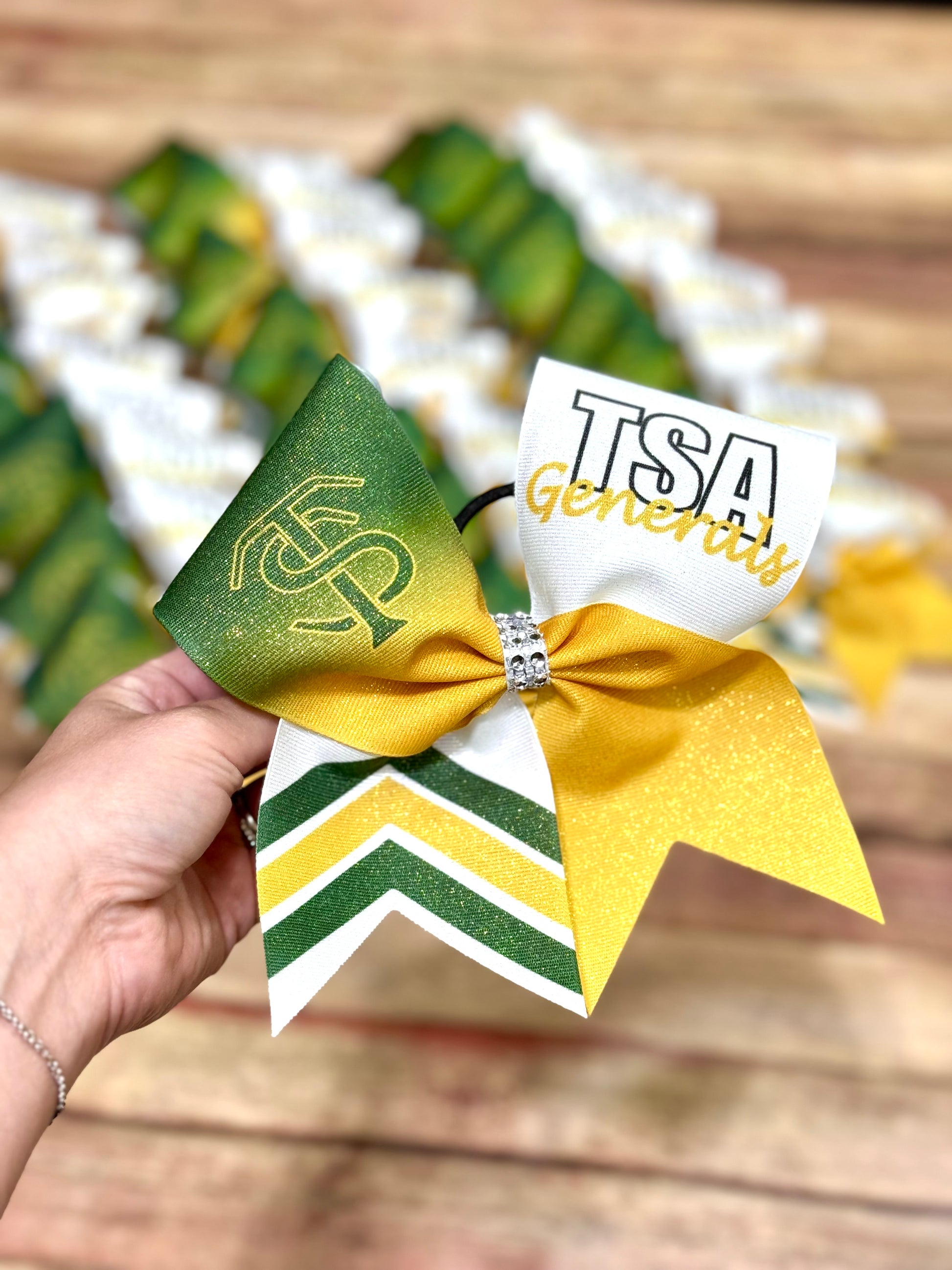 Get ready to cheer in style with our customizable glitter ribbon cheer bow! Handmade with care and passion in the USA. Order yours today and let your team spirit shine! 📣