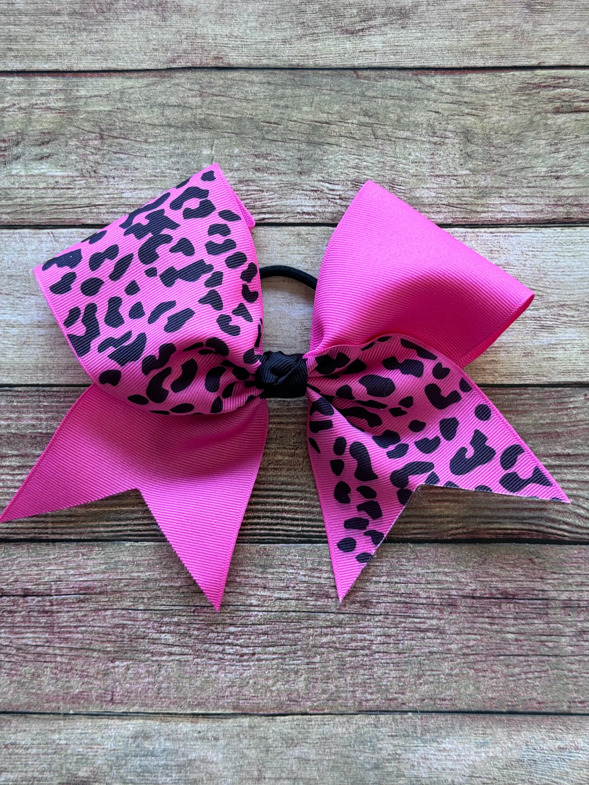 Extra large cheer bow featuring sublimated leopard print along the left loop and right tail. Perfect for dance or cheer, and is a great way to show off your school pride! All our leopard bows are made of hot pink grosgrain ribbon, cut into a V tail with the perfect print sublimated on top and finished off with a black knot for the center. All our bows are secured with a heavy-duty elastic metal free hair tie.