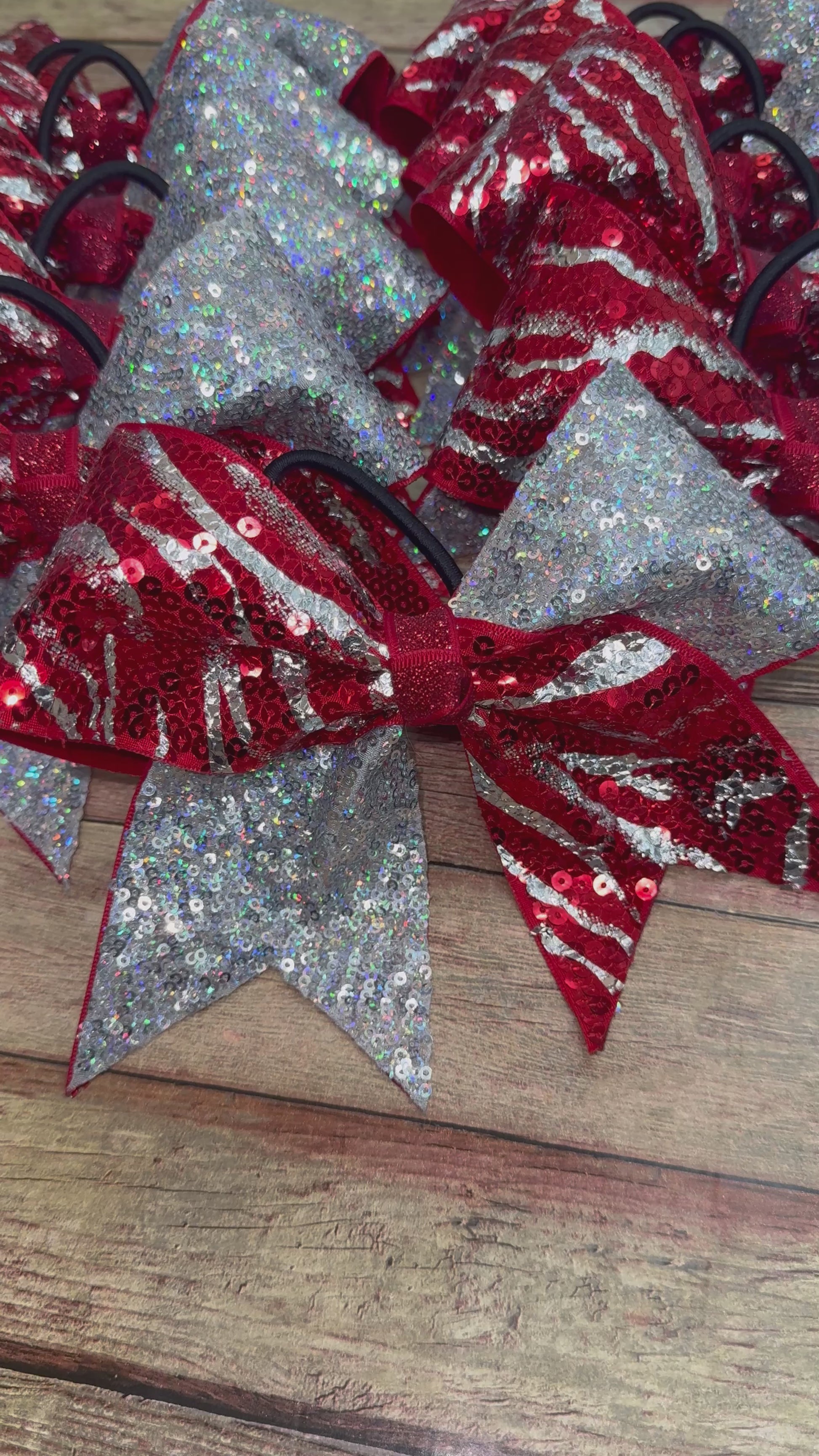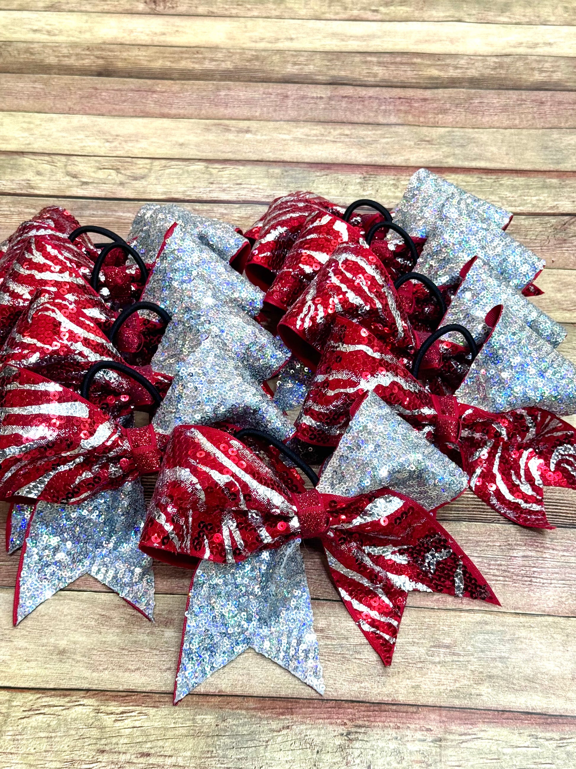 Introducing our stunning 3 inch extra large cheer bow, handcrafted with care in the USA by our family-owned and operated business. This eye-catching bow features a combination of silver sequin fabric on the right loop and left tail, and red and silver zebra print fabric on the left loop and right tail. The vibrant colors and bold patterns make this bow a perfect accessory to stand out on the cheerleading field.