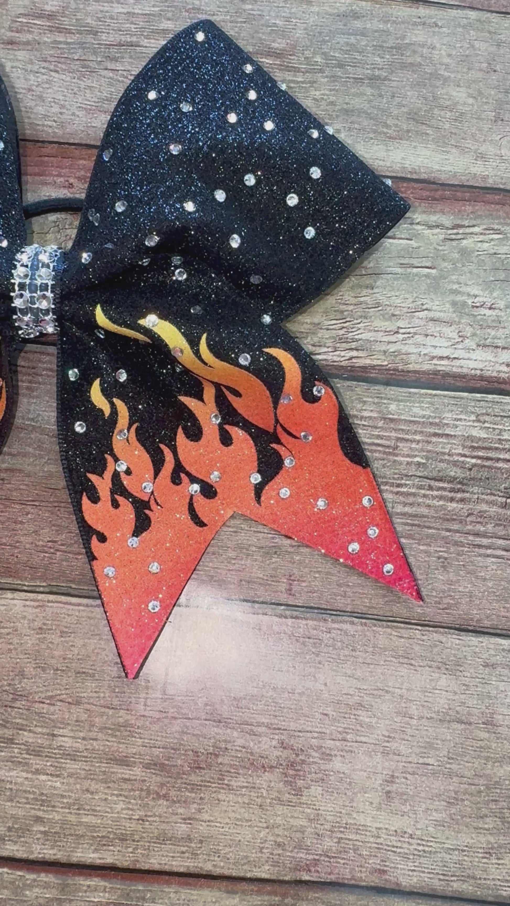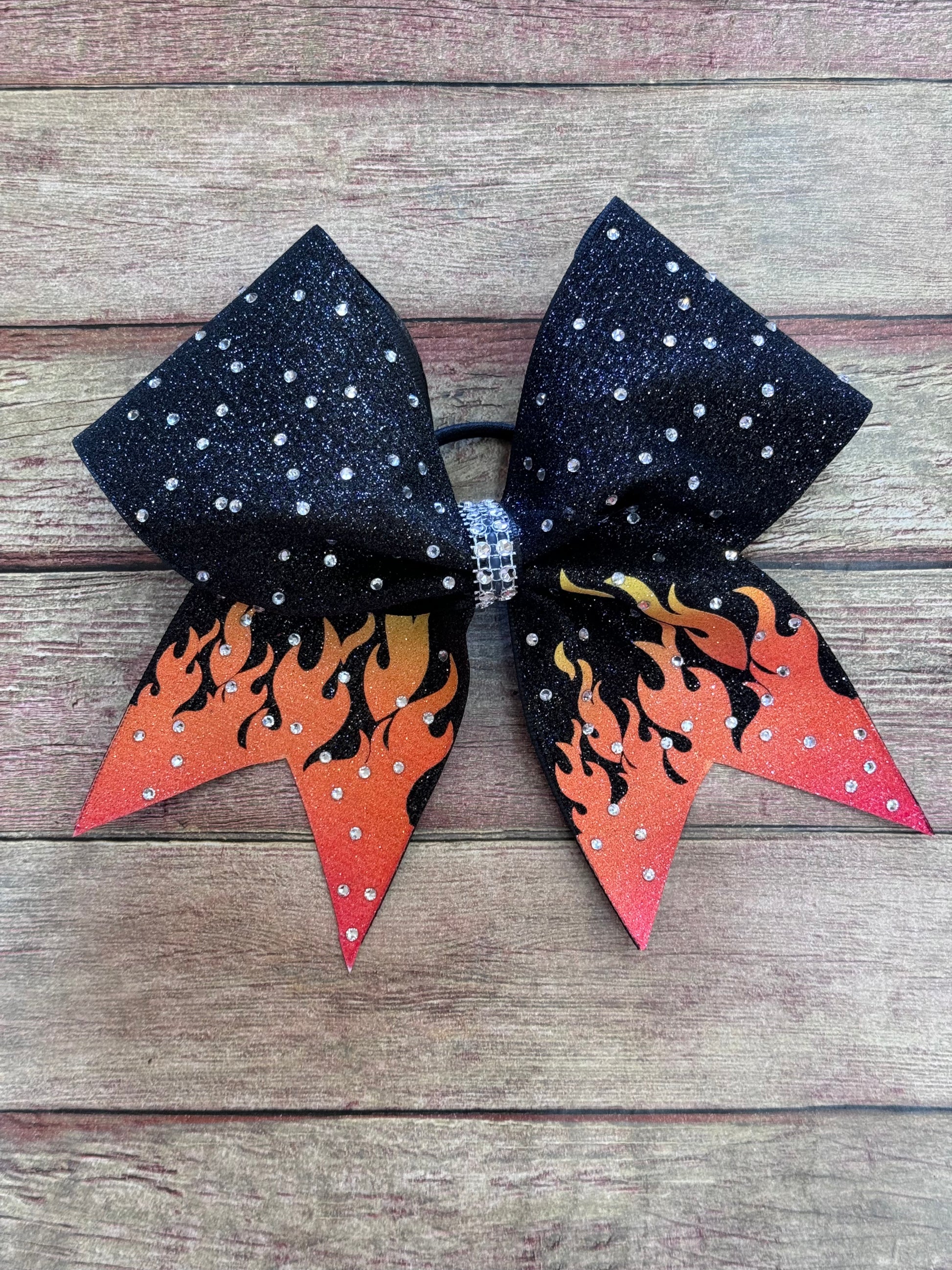 The cheer bow with flames on the tail is a stunning accessory that adds a touch of glamour to any outfit. Made with premium glitter and finished with rhinestones, this bow is sure to catch the eye. The flames are elegantly designed in a yellow to red sublmated ombre colorway, on top of premium black glitter.